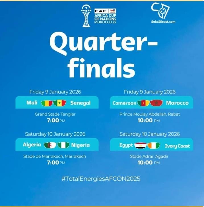 The quarter-final lineup is set, with Mali taking on Senegal and Cameroon facing hosts Morocco on Friday, January 9. Algeria will be taking on Nigeria on Saturday January 10 in what will be the replay of the 2019 semi final where Riyad Mahrez late penalty sent the Super Eagles home. Cote D’Ivoire will then face Egypt in the other game.